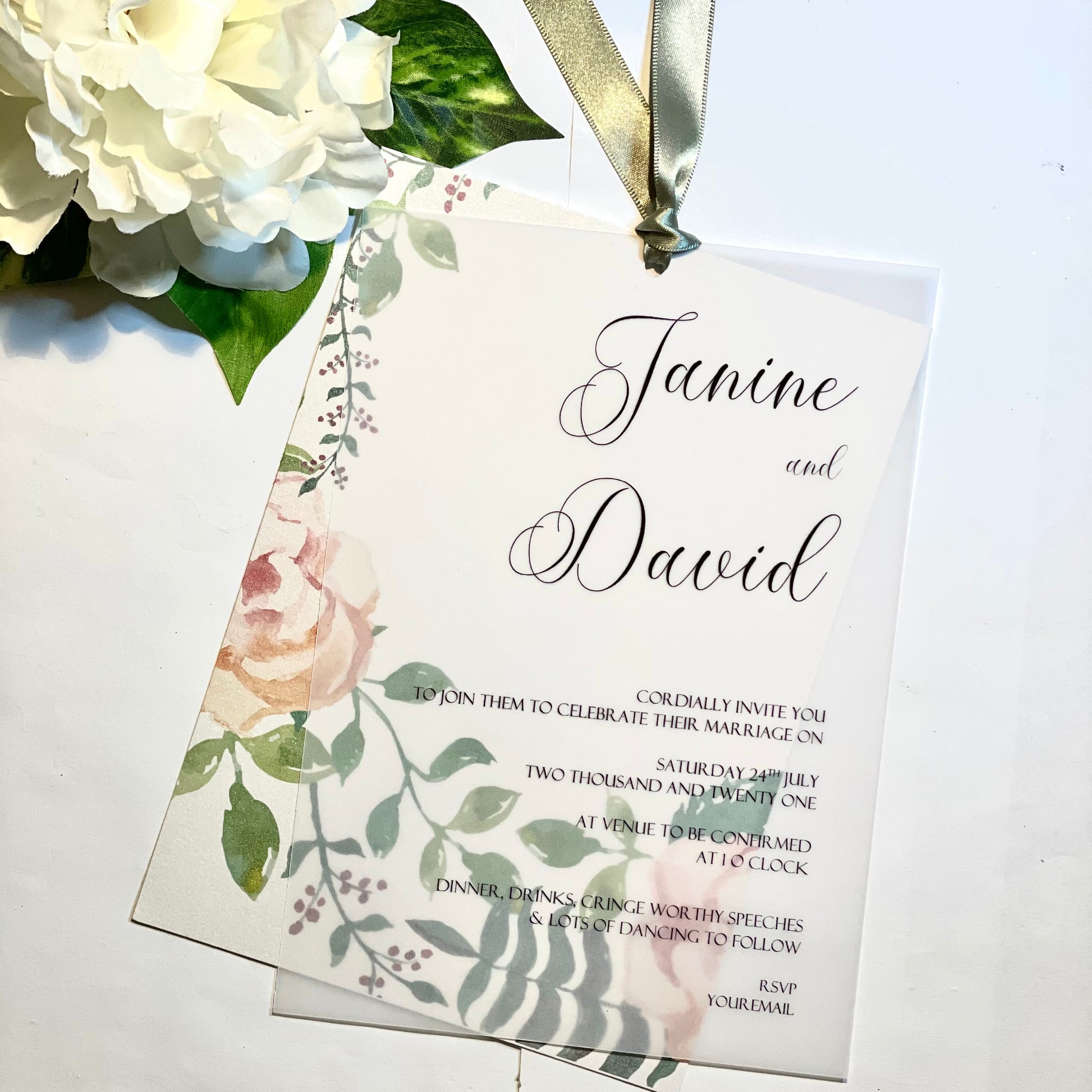 Spring Floral Loop-Tied Wedding Invitation with Vellum Overlay